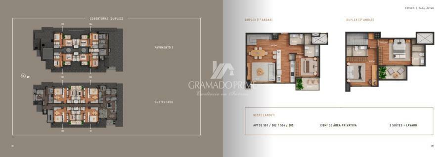 Composta de 03 suítes (uma suíte térrea com sacada), a cobertura conta com incríveis 138m² de área privativa, amplo living dois ambientes, cozinha com churrasqueira, área de serviço e duas vagas de garagem (box duplo).